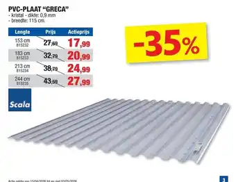 Bekijk en vergelijk de bovenstaande aanbiedingen om te zien of Pvc-plaat greca binnenkort opnieuw als actie verschijnt. Wij volgen alle prijzen en promoties op, zodat u uw aankopen voordelig kan plannen. Door Pvc-plaat greca aanbiedingen met elkaar te vergelijken, weet u snel of het loont om nog even te wachten voor een lagere prijs. Kom regelmatig terug voor de nieuwste promo-updates.Veelgestelde vragen over Pvc-plaat greca