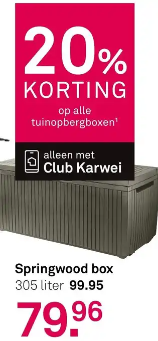 Karwei heeft een ruim assortiment naast de Springwood box, houd elke week de Karwei folder in de gaten om de beste aanbiedingen en promoties te vinden. Naast Springwood box in promotie kan u ook volgende aanbiedingen vinden: Keter Springwood box, Keter Kussenbox Springwood & Box in thermowood.