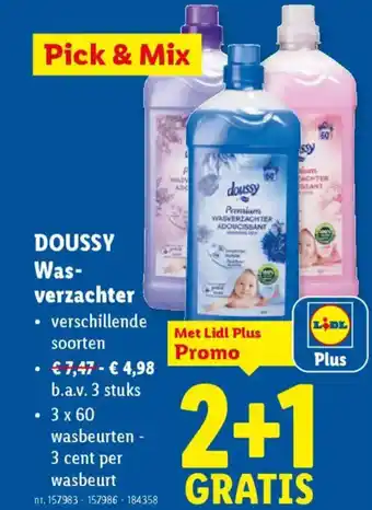 Lidl heeft een ruim assortiment naast de Doussy was verzachter, houd elke week de Lidl folder in de gaten om de beste aanbiedingen en promoties te vinden. Naast Doussy was verzachter in promotie kan u ook volgende aanbiedingen vinden: Doussy wasverzachter, aanbieding 2 & aanbieding 3.