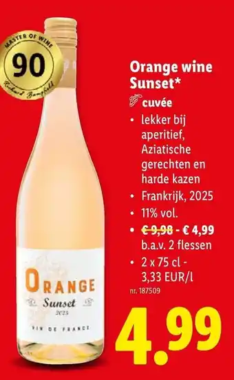De Orange wine Sunset is momenteel in aanbieding bij Lidl. Op deze pagina vindt u alle informatie over de actuele prijs, promotievoorwaarden en geldigheidsperiode. U kan ook andere acties en vergelijkbare aanbiedingen bekijken, zodat u steeds de voordeligste keuze maakt. De promotie loopt van 18-02-2026 tot en met 24-02-2026. Is de actie afgelopen? Geen probleem – alternatieve Orange wine Sunset promo’s blijven beschikbaar. U kan de productcategorie volgen om automatisch verwittigd te worden wanneer Orange wine Sunset opnieuw in aanbieding komt.Veelgestelde vragen over Orange wine Sunset