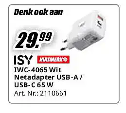 MediaMarkt heeft een ruim assortiment naast de IWC-4065 Wit Netadapter USB-A / USB-C 65 W, houd elke week de MediaMarkt folder in de gaten om de beste aanbiedingen en promoties te vinden. Naast IWC-4065 Wit Netadapter USB-A / USB-C 65 W in promotie kan u ook volgende aanbiedingen vinden: ISY IWC-4065 Wit Netadapter USB-A/USB-C 65 W, 32 W autolader - USB C en USB A & Snellader, 1x USB-C, 1x USB-A, mini-oplader, 20 W, wit.