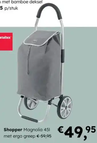 De Metaltex Shopper Magnolia is momenteel beschikbaar met korting bij Multi bazar. Hier vindt u alle details over de actuele prijs, de voorwaarden van de promotie en de geldigheidsduur. Bekijk zeker ook de andere aanbiedingen en acties rond Metaltex Shopper Magnolia om zeker te zijn dat u aan de laagste prijs koopt. De promotie loopt van 20-04-2026 tot 30-06-2026. Is de actie intussen verlopen? U vindt steeds andere interessante aanbiedingen en promoties in dezelfde categorie. Door Metaltex Shopper Magnolia prijzen en promo’s te vergelijken, bent u zeker dat u nooit te veel betaalt.Veelgestelde vragen over Metaltex Shopper Magnolia