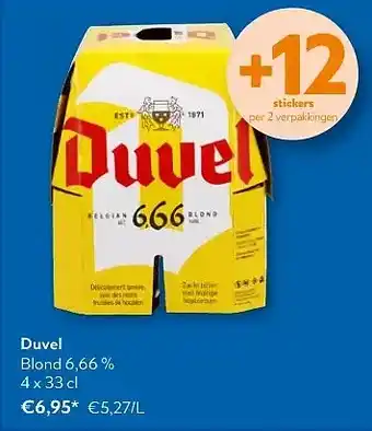 De Duvel Blond 6,66% 4 x 33 cl is momenteel beschikbaar met korting bij OKay. Hier vindt u alle details over de actuele prijs, de voorwaarden van de promotie en de geldigheidsduur. Bekijk zeker ook de andere aanbiedingen en acties rond Duvel Blond 6,66% 4 x 33 cl om zeker te zijn dat u aan de laagste prijs koopt. De promotie loopt van 25-02-2026 tot 10-03-2026. Is de actie intussen verlopen? U vindt steeds andere interessante aanbiedingen en promoties in dezelfde categorie. Door Duvel Blond 6,66% 4 x 33 cl prijzen en promo’s te vergelijken, bent u zeker dat u nooit te veel betaalt.Veelgestelde vragen over Duvel Blond 6,66% 4 x 33 cl