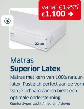 De Matras Superior Latex is momenteel beschikbaar met korting bij Sleeplife. Hier vindt u alle details over de actuele prijs, de voorwaarden van de promotie en de geldigheidsduur. Bekijk zeker ook de andere aanbiedingen en acties rond Matras Superior Latex om zeker te zijn dat u aan de laagste prijs koopt. De promotie loopt van 05-01-2026 tot 31-01-2026. Is de actie intussen verlopen? U vindt steeds andere interessante aanbiedingen en promoties in dezelfde categorie. Door Matras Superior Latex prijzen en promo’s te vergelijken, bent u zeker dat u nooit te veel betaalt.Veelgestelde vragen over Matras Superior Latex