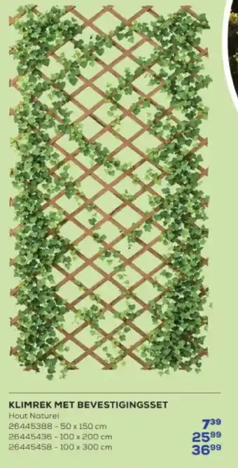 Supra Bazar heeft een ruim assortiment naast de Klimrek met bevestigingsset, houd elke week de Supra Bazar folder in de gaten om de beste aanbiedingen en promoties te vinden. Naast Klimrek met bevestigingsset in promotie kan u ook volgende aanbiedingen vinden: Klimrek Uitbreidbaar, Bevestigingsset schaduwdoek driehoek zwart & Bevestigingsset schaduwdoek vierkant RVS.