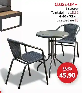 Deze promotie is bij diverse winkels in de aanbieding, bekijk alle producten om te zien welke CLOSE-UP het goedkoopst is.Als u wilt weten of dit product meer korting heeft in een andere winkel kan u vergelijken onder de categorie 'Wonen'. Wellicht vindt u deze aanbiedingen ook interessant: Close-up Bistroset, Pick Up! & Pick Up!.