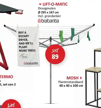 Weba heeft een ruim assortiment naast de LIFT-O-MATIC, houd elke week de Weba folder in de gaten om de beste aanbiedingen en promoties te vinden. Naast LIFT-O-MATIC in promotie kan u ook volgende aanbiedingen vinden: Lift-o-matic droogmolen, Brabantia Droogmolen lift-o-matic & Verlengstuk Top-Lift.