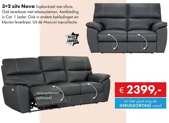 Woonsquare heeft een ruim assortiment naast de 3+2 zits Nova, houd elke week de Woonsquare folder in de gaten om de beste aanbiedingen en promoties te vinden. Naast 3+2 zits Nova in promotie kan u ook volgende aanbiedingen vinden: 2,5 Zits Anglet, 3,5 Zits Amalfi & 3+2 zits Bologna.