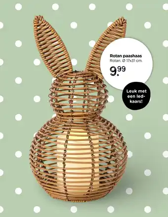Deze promotie is bij diverse winkels in de aanbieding, bekijk alle producten om te zien welke Rotan paashaas het goedkoopst is.Als u wilt weten of dit product meer korting heeft in een andere winkel kan u vergelijken onder de categorie 'Wonen'. Wellicht vindt u deze aanbiedingen ook interessant: Chocolade paashaas, Paashaas & Paashaas.