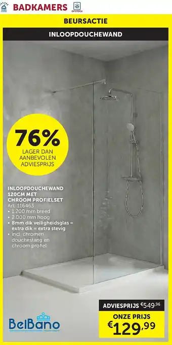 De INLOOPDOUCHEWAND 120CM MET CHROOM PROFIELSET is momenteel beschikbaar met korting bij Zelfbouwmarkt. Hier vindt u alle details over de actuele prijs, de voorwaarden van de promotie en de geldigheidsduur. Bekijk zeker ook de andere aanbiedingen en acties rond INLOOPDOUCHEWAND 120CM MET CHROOM PROFIELSET om zeker te zijn dat u aan de laagste prijs koopt. De promotie loopt van 24-02-2026 tot 23-03-2026. Is de actie intussen verlopen? U vindt steeds andere interessante aanbiedingen en promoties in dezelfde categorie. Door INLOOPDOUCHEWAND 120CM MET CHROOM PROFIELSET prijzen en promo’s te vergelijken, bent u zeker dat u nooit te veel betaalt.Veelgestelde vragen over INLOOPDOUCHEWAND 120CM MET CHROOM PROFIELSET