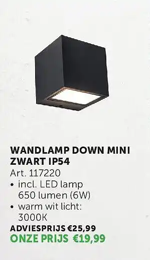 De prijs van WANDLAMP DOWN MINI ZWART IP54 kan u vinden bovenaan de pagina, waarbij ook de geldigheidsdata worden genoemd. Daarnaast is de prijs ook te vinden in de huidige Zelfbouwmarkt folder of op de website van Zelfbouwmarkt. U bent verzekerd van producten aan de laagste prijs bij Zelfbouwmarkt als u artikelen in promotie koopt.